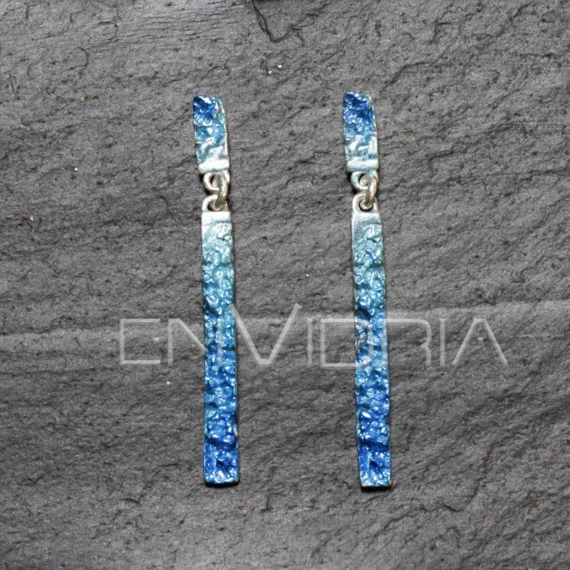 Pendiente rectangular de dos piezas en plata pigmentos orgánicos en tonos azules. Diseñado y realizado a mano por EnVidria.