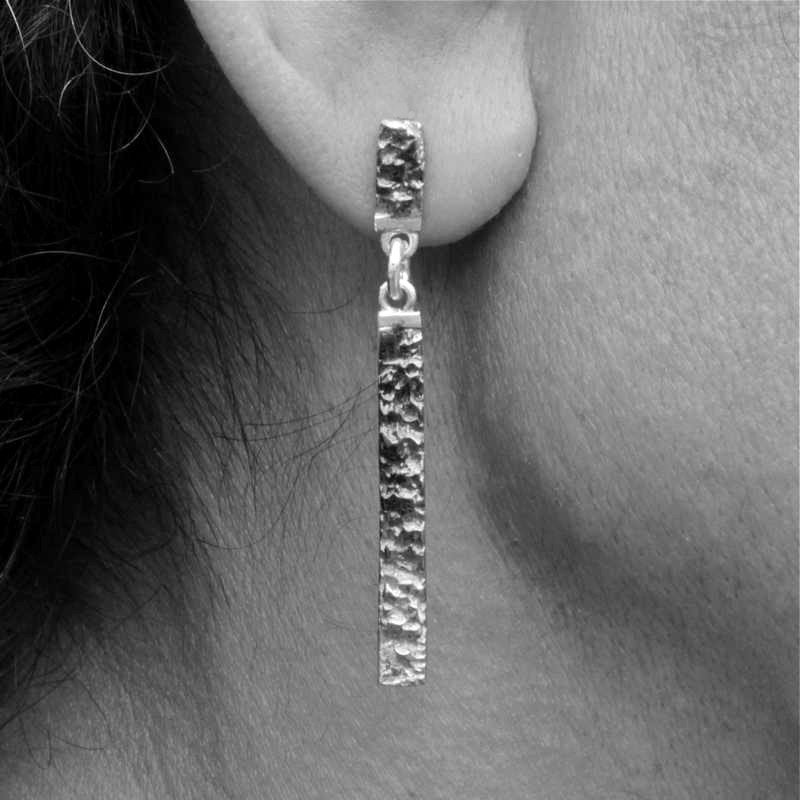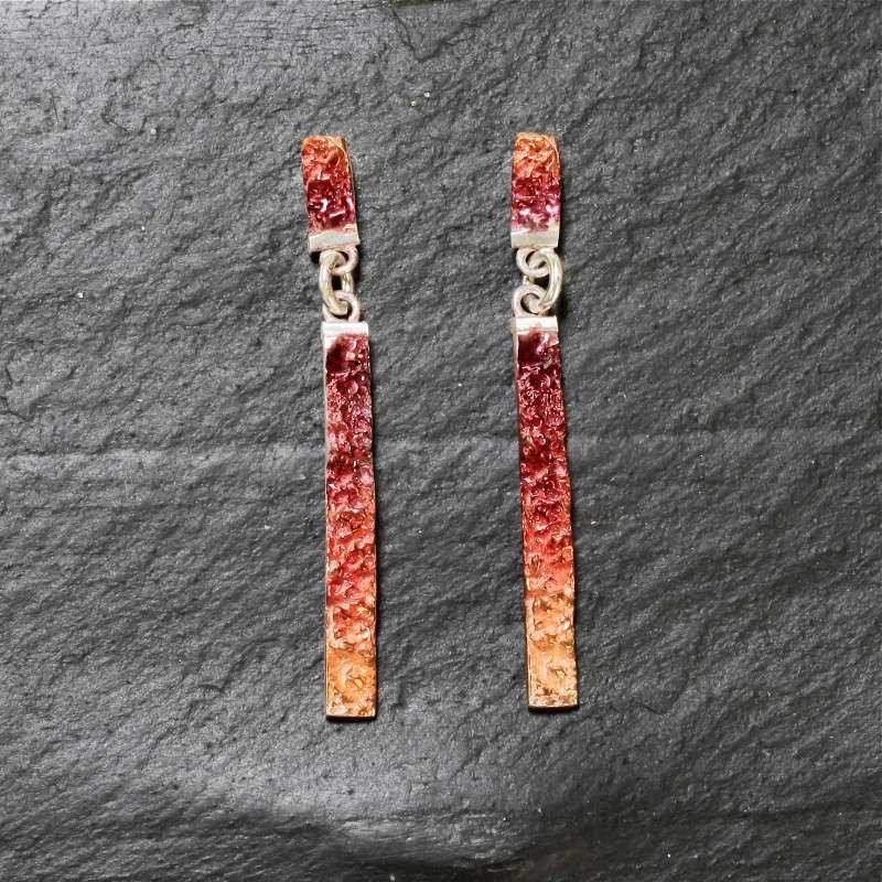 Pendiente orgánico rectangular de dos piezas con pigmentos de color rojo en plata diseñado y realizado a mano por EnVidria