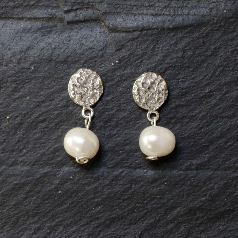 Pendiente redondo de plata en color plata brillante con perla natural de agua dulce, diseñado y elaborado a mano por EnVidria
