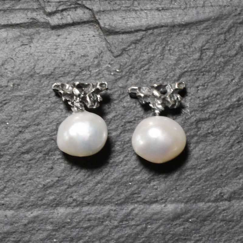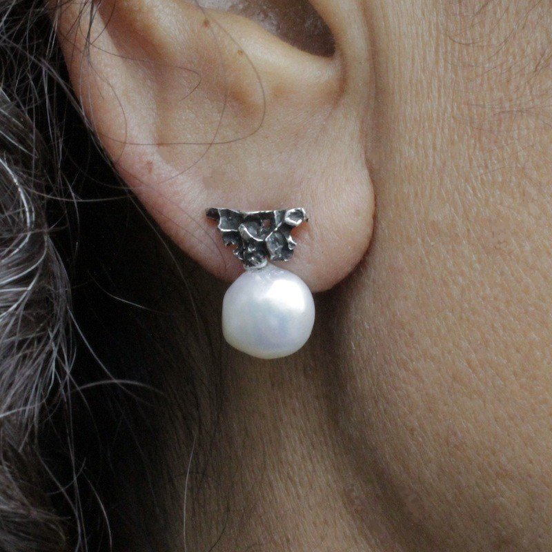 Pendiente triangular con perla natural de agua dulce en plata de color plata vieja, diseñado y elaborado a mano por EnVidria.