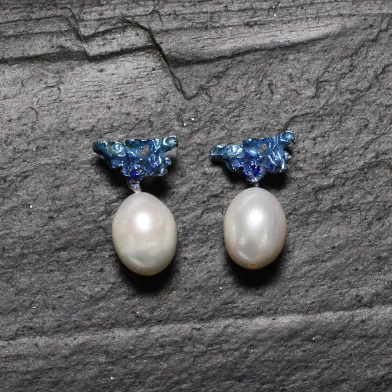 Pendiente triangular de plata en color azul con perla natural de agua dulce